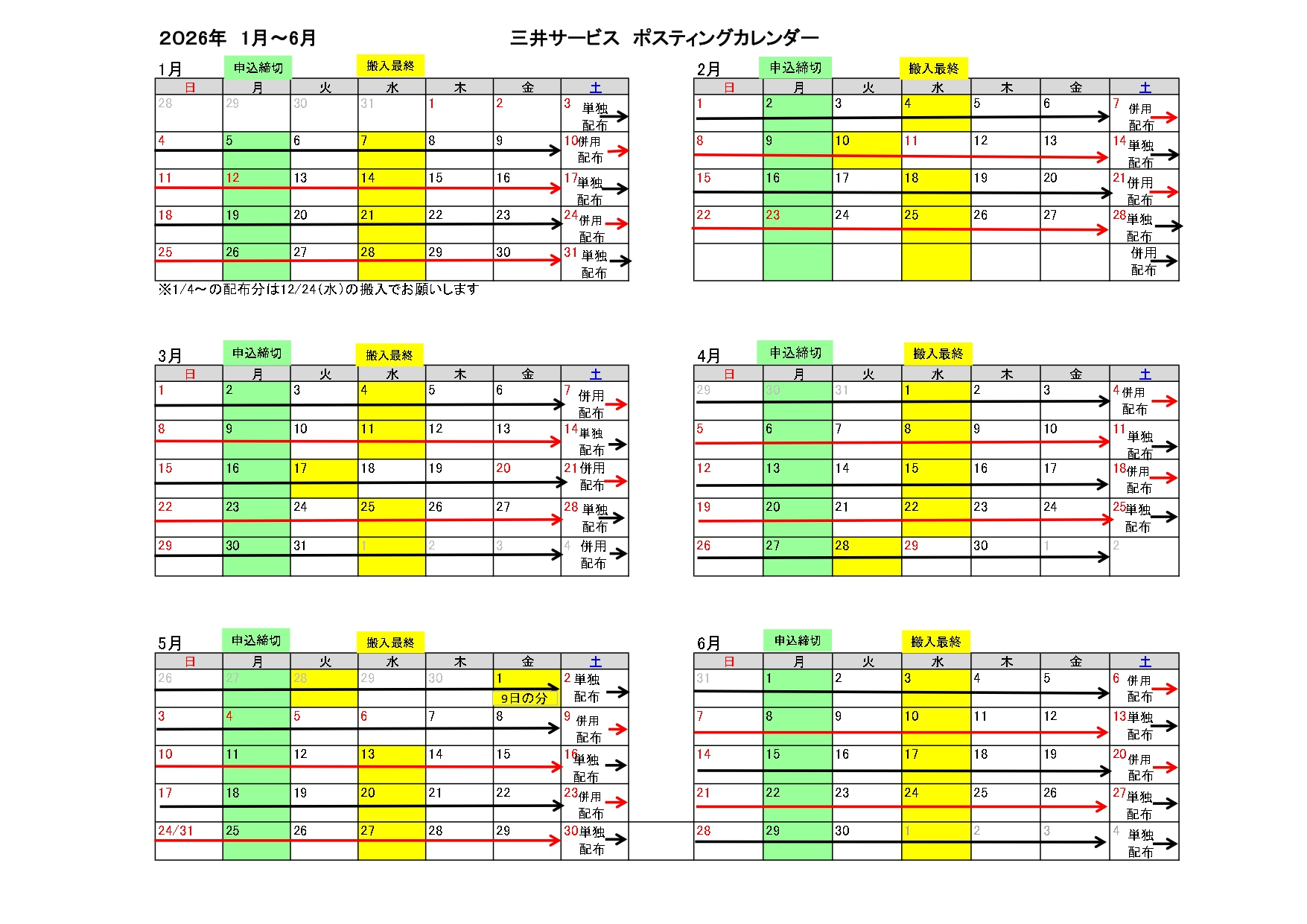 クライアント複数社の販促物を併せて配布 土曜日~翌週金曜日の配布 ※下記のポスティングカレンダーをご参照ください。